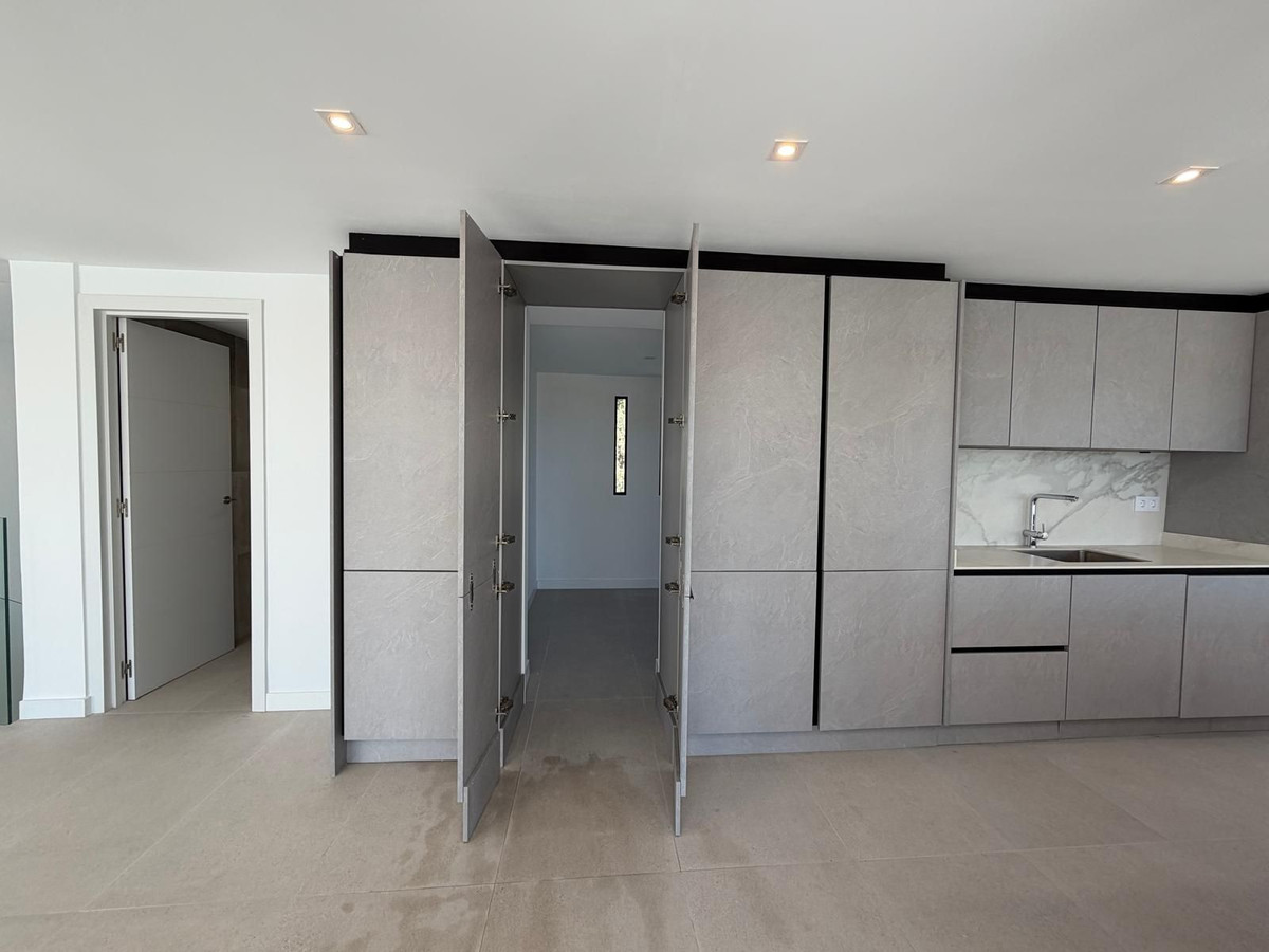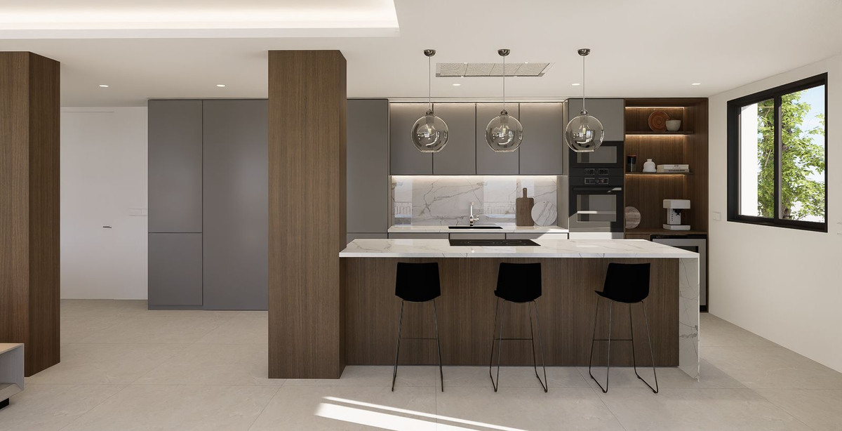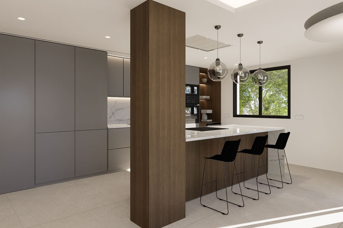 Rebosante de luz natural, la villa cuenta con salas de estar diáfanas con grandes ventanales y puertas de cristal que conectan a la perfección los espacios interiores y exteriores, y disfruta de agradables vistas al mar. La moderna cocina americana cuenta con una gran isla central con placa de cocción integrada, ideal tanto para el día a día como para recibir invitados.
