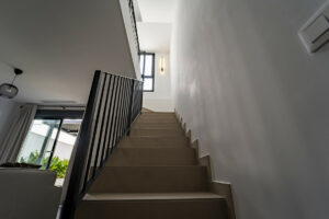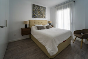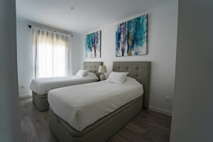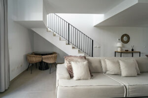 En la primera planta hay dos acogedores dormitorios: uno con cama doble y otro con dos camas individuales. La planta superior está reservada para la suite principal, que incluye un baño privado y una terraza exclusiva, el lugar perfecto para disfrutar de momentos de tranquilidad bajo el sol.
