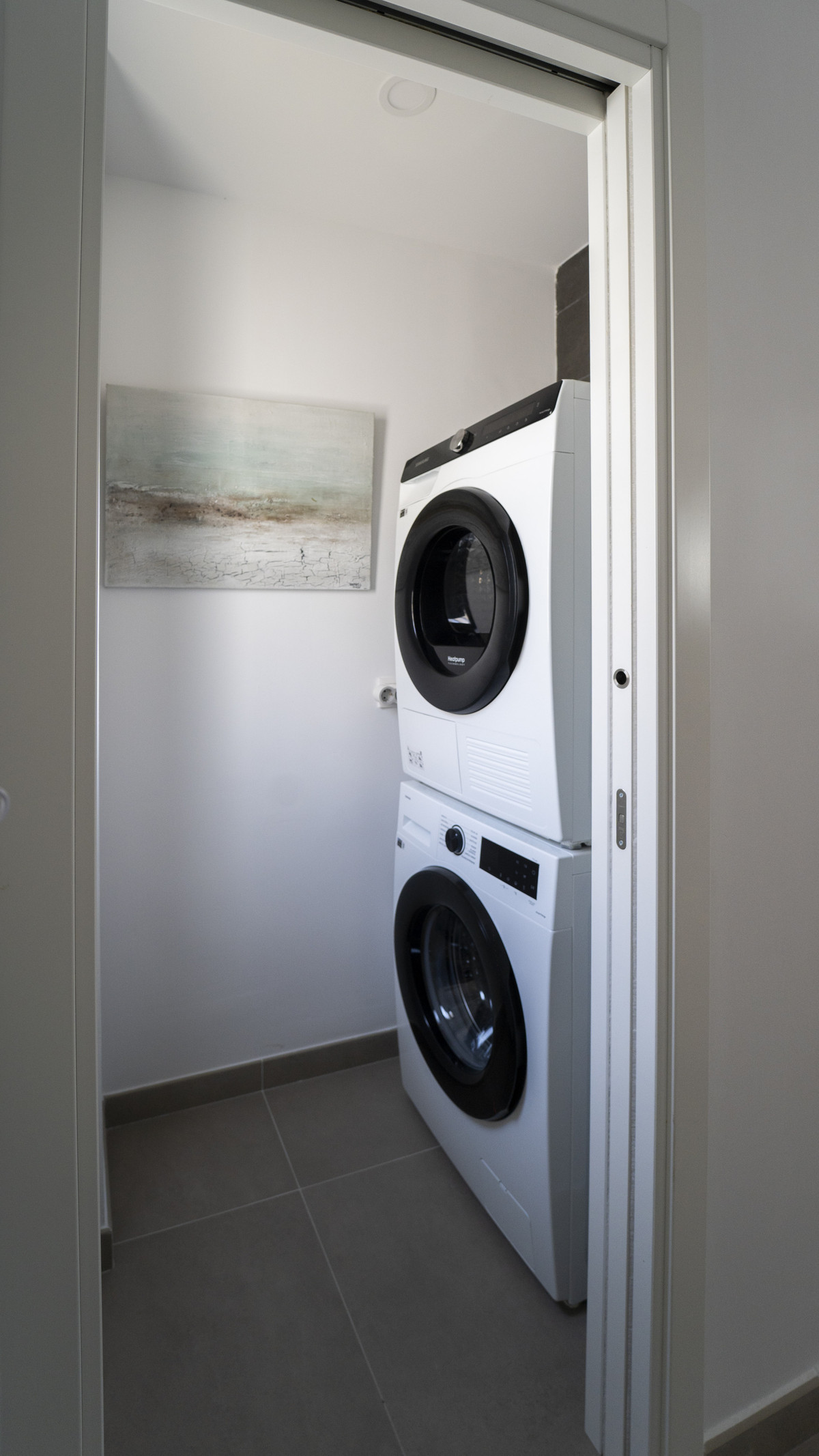 En la planta baja se encuentra un amplio salón que se abre directamente a una terraza privada, ideal para relajarse o recibir invitados. La cocina contemporánea está completamente integrada en el espacio de estar y también hay una zona de lavandería independiente equipada con lavadora y secadora para mayor comodidad. La vivienda ofrece un total de tres dormitorios y dos baños, diseñados para alojar cómodamente a familias, parejas o grupos.