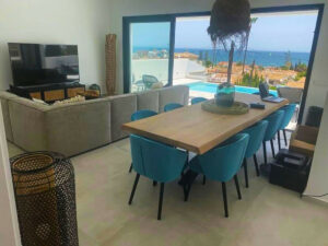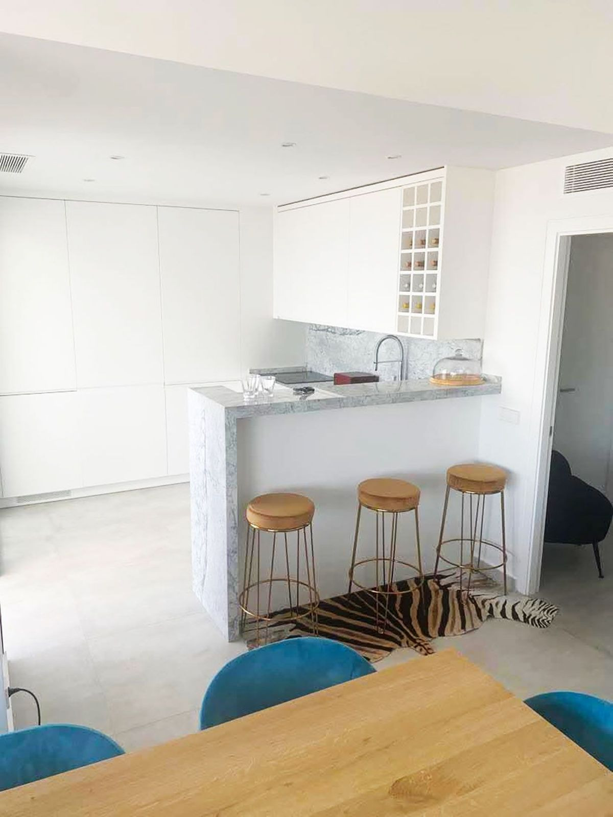 Las amplias cristaleras inundan los interiores de luz natural y ofrecen impresionantes vistas al mar desde casi todos los rincones de la vivienda. La cocina moderna, completamente equipada, cuenta con electrodomésticos de alta gama y puede personalizarse a tu gusto. Se abre directamente al comedor, ideal para reuniones con familiares y amigos.