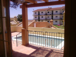 Dos dormitorios dobles con armarios empotrados , Uno con vistas al jardín delantero y el otro con vistas a la piscina y vista parcial al mar