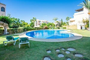 El complejo cuenta con cuatro piscinas comunitarias, jardines bien cuidados y aparcamiento privado.