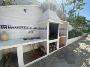 La cocina es amplia, con espacio suficiente para una mesa de desayuno, y tiene acceso directo a la parte trasera de la propiedad, donde encontrarás una zona cubierta para aparcar y una barbacoa integrada, ideal para reuniones al aire libre.