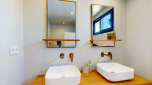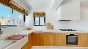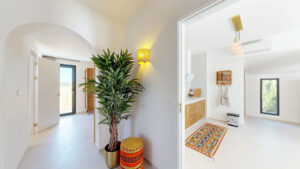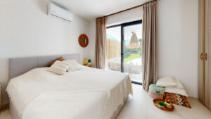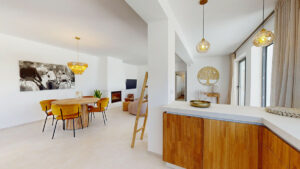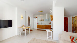 A través de un pasillo interior se accede a un apartamento independiente, perfecto para alojar invitados o como segunda vivienda dentro de la misma parcela. Este espacio dispone de un salón-comedor con cocina abierta, un dormitorio con baño en suite y su propio acceso desde el exterior, ofreciendo total privacidad.