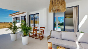 La casa principal cuenta con un amplio salón con chimenea de estilo andaluz, una cocina abierta artesanal con mobiliario de madera maciza y electrodomésticos nuevos de alta gama, dos dormitorios con baños en suite y un aseo de invitados. Desde el salón y la cocina se accede directamente a una gran terraza soleada y a la piscina privada completamente renovada, rodeada de jardines con riego automático e iluminación nueva.
