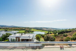 Esta moderna villa de nueva construcción en Valle Romano Golf, Estepona, ofrece impresionantes vistas panorámicas tanto al campo de golf como al mar Mediterráneo.