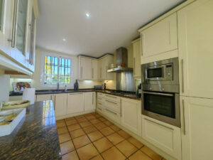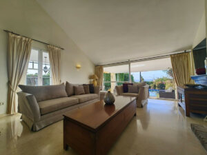 La villa consta de 3 amplios dormitorios, cada uno con su propio cuarto de baño, además de un aseo para invitados. La planta baja cuenta con un gran salón con chimenea y comedor, una cocina independiente totalmente equipada y un encantador patio acristalado orientado al oeste, perfecto para disfrutar de las puestas de sol durante todo el año. Desde el salón y la terraza cubierta, la posición elevada permite disfrutar de unas vistas ininterrumpidas de la piscina y los jardines.