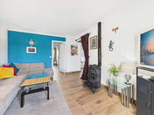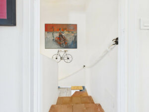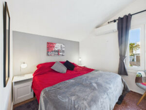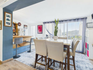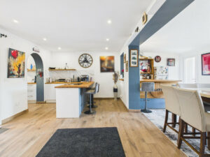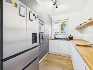 La cocina está equipada con encimeras de roble macizo, incluyendo una elegante barra que aporta calidez y carácter a la vivienda. El sistema de aire acondicionado garantiza confort durante todo el año.