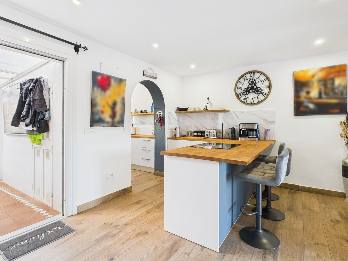 La cocina está equipada con encimeras de roble macizo, incluyendo una elegante barra que aporta calidez y carácter a la vivienda. El sistema de aire acondicionado garantiza confort durante todo el año.