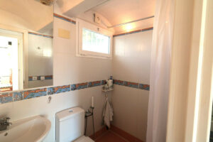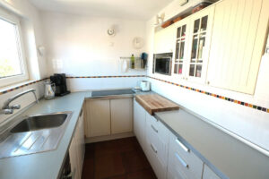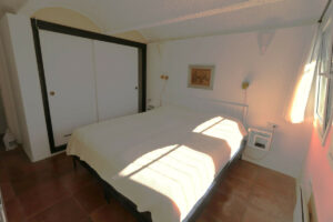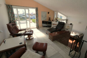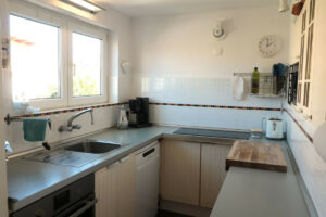 Se accede a la casa por la planta baja, donde se encuentran tres dormitorios, armarios empotrados, un trastero con ventana con la posibilidad de crear un cuarto dormitorio, según se prefiera, y dos baños, uno de ellos en suite. Desde todos los dormitorios se tiene acceso al jardín privado orientado al sur. El gran patio junto a la entrada ofrece un lugar idílico y sombreado, especialmente en verano, que invita a quedarse. Solo hay que atravesar la pequeña puerta del jardín y se puede pasear directamente hasta la playa.