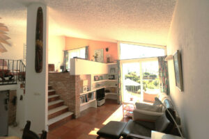En la planta superior, la propiedad ofrece una luminosa zona de estar abierta con techos altos, un comedor y una cocina totalmente equipada. A continuación, subiendo otro pequeño tramo de escaleras, se llega al salón principal y al acceso a la gran terraza, una parte de la cual está cubierta para disfrutar de la puesta de sol o simplemente del clima mediterráneo.