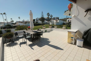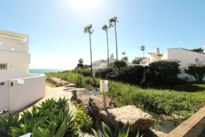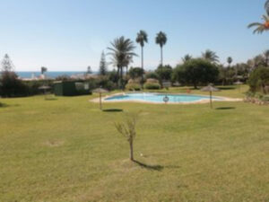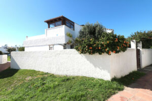 Villa independiente muy acogedora junto a la playa con maravillosas vistas al jardín comunitario y pequeñas vistas al mar y a África, ¡a solo unos metros del mar! Desde la casa se puede ir andando o en bicicleta a Estepona o a la Duquesa por la playa.