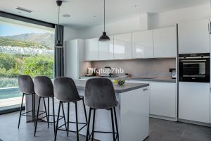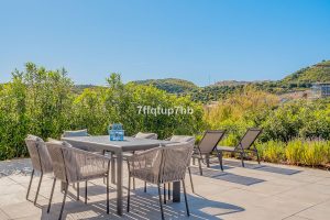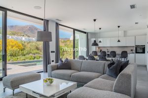 El corazón de la vivienda lo forman su luminoso salón-comedor con cocina abierta de estilo moderno, que conecta directamente con una agradable terraza y jardín privado, perfectos para disfrutar del entorno natural y del clima de la Costa del Sol. La villa también incluye piscina climatizada y zona de cine, ideal tanto para el descanso como para el ocio.