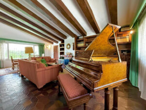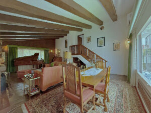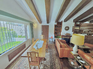 •Amplio salón-comedor de más de 60 m², de techo alto con vigas decorativas, chimenea y una elegante biblioteca de madera noble.