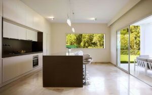 * La cocina se integra directamente con un comedor formal y la amplia y luminosa sala de estar, que cuenta con una acogedora chimenea y se abre al jardín a través de grandes ventanales.