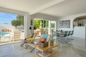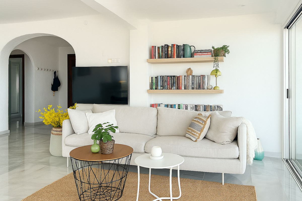 La luminosa zona de estar de planta abierta se conecta perfectamente con una cocina totalmente equipada y una terraza cubierta, creando el ambiente ideal tanto para relajarse como para disfrutar con familia y amigos.