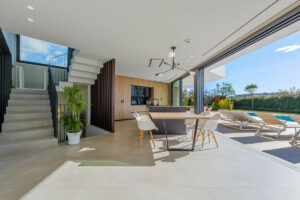 La vivienda se organiza en cuatro niveles perfectamente integrados, combinando espacios amplios y luminosos con una conexión constante con el entorno. En la planta principal se encuentra un elegante espacio diáfano que integra salón, comedor y cocina de diseño con isla central, acompañado de grandes ventanales que amplían visualmente la vivienda. En este nivel también se ubican el recibidor, un aseo de cortesía y un garaje cerrado para dos vehículos. La villa dispone además de piscina privada y jardín con riego automático. La zona de la piscina, rodeada por un amplio porche cubierto y un solárium pavimentado, crea el escenario perfecto para el descanso y las reuniones al aire libre.