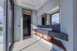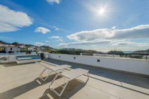 La zona de descanso, situada en la planta superior, alberga tres amplios dormitorios. La suite principal dispone de vestidor y baño en suite, mientras que los otros dos dormitorios comparten un baño completo. Todas las estancias cuentan con acceso directo a generosas terrazas, ideales para disfrutar de las vistas y de los atardeceres. En la planta cubierta, un espectacular solárium corona la vivienda con vistas panorámicas al entorno y al mar. El sótano ofrece un espacio polivalente con múltiples posibilidades, como gimnasio, sala de cine o almacenamiento, además de una zona destinada a las instalaciones.