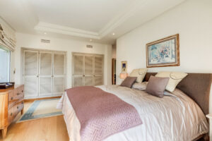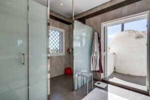 En la planta superior se encuentra el elegante dormitorio principal, que cuenta con su propio baño en suite, un espacioso vestidor y una terraza privada donde podrás despertar con vistas apacibles al jardín y al mar. Además, hay otro dormitorio y un baño independiente, ofreciendo el máximo confort y privacidad para la familia o los invitados.