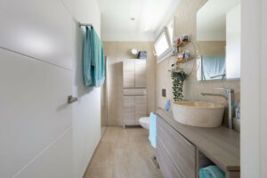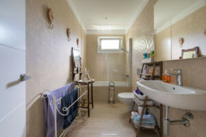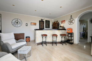 Planta principal con luminoso salón-comedor en dos niveles, amplia cocina, un dormitorio + baño con bañera y suite principal con baño en suite (ducha), zona de bar (fácilmente convertible en otro dormitorio) y terraza cubierta/barbacoa que da acceso a la piscina, la caseta de la piscina y la zona chill-out.
