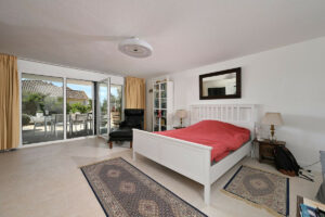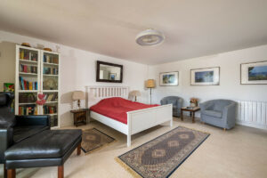 Planta independiente para invitados con grandes ventanales, cocina, dormitorio y baño con vistas al jardín y la piscina.