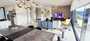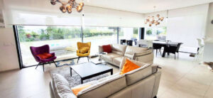 Al entrar, se sorprenderá por el amplio y luminoso salón-comedor, inundado de luz natural gracias a las ventanas de pared a pared que ofrecen vistas espectaculares del jardín y la piscina climatizada. Estas grandes puertas de vidrio se abren completamente, fusionando los espacios interiores y exteriores, permitiéndole disfrutar del clima soleado y de un estilo de vida al aire libre.