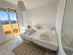 Primera Planta: Aquí se encuentra la zona de descanso. El amplio dormitorio principal cuenta con su propio baño en suite. Además, hay dos encantadores dormitorios que comparten un baño de diseño. Ambos dormitorios tienen acceso directo a la terraza superior: imagine despertar cada mañana con una vista ininterrumpida de todo el valle y el mar.