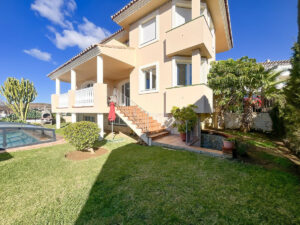 La propiedad incluye aparcamiento privado dentro de la parcela, protegido por una elegante puerta de hierro forjado que complementa perfectamente el estilo arquitectónico de la villa.