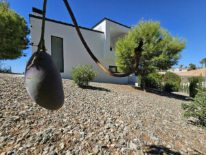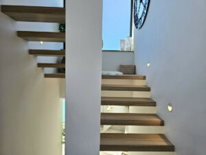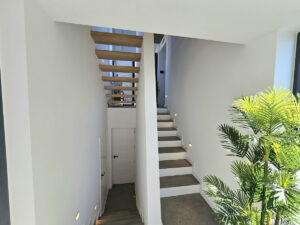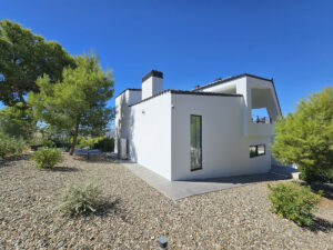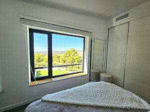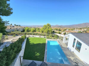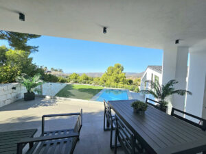 Villa de diseño con dos zonas bastante delimitadas, en una de ellas esta la zona de salon, comedor y zona social von gran porche y acceso a la piscina. En la planta superior el dormitorio principal con vestidor y baño y terraza con vistas a la montaña.