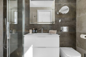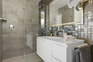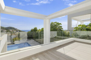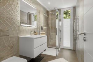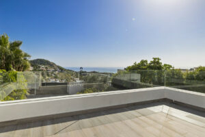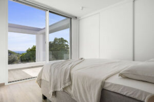 En la planta superior, los dos dormitorios principales adicionales tienen cada uno su propio baño y amplias terrazas, creando pequeños santuarios de tranquilidad dentro de la casa.