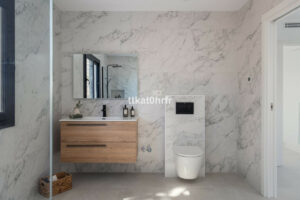 Distribuida en dos plantas, la vivienda cuenta con tres amplios dormitorios, cada uno con su propio baño en suite. Dos de los dormitorios disfrutan de unas bonitas y parciales vistas al mar, mientras que un elegante aseo de invitados añade un extra de comodidad.