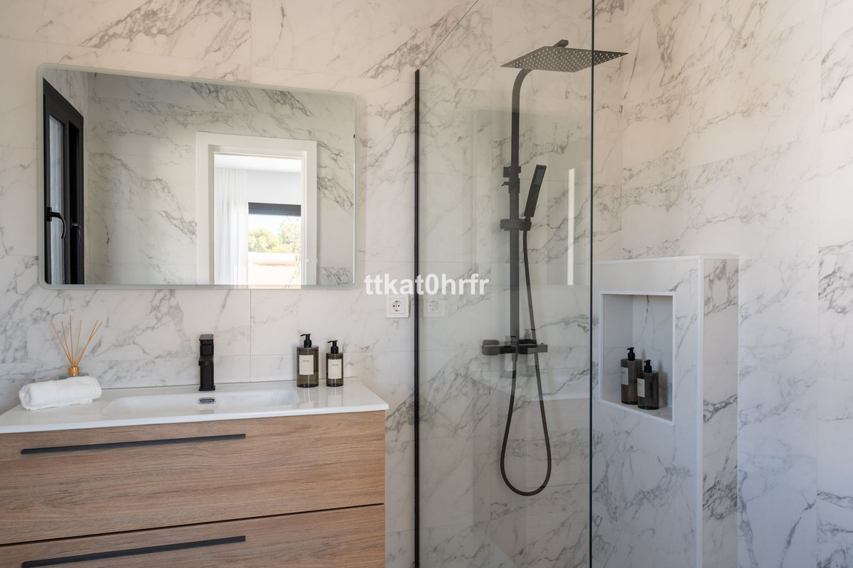 Distribuida en dos plantas, la vivienda cuenta con tres amplios dormitorios, cada uno con su propio baño en suite. Dos de los dormitorios disfrutan de unas bonitas y parciales vistas al mar, mientras que un elegante aseo de invitados añade un extra de comodidad.
