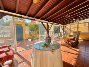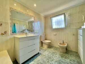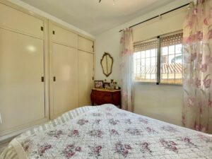 La vivienda ofrece 115 m² distribuidos en tres amplios dormitorios con armarios empotrados, tres baños completos (uno exterior, junto a la piscina), un luminoso salón con chimenea y acceso al jardín, y cocina independiente con salida a un patio privado.