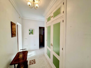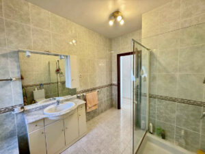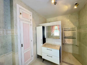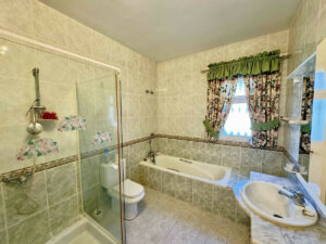 La casa ofrece 3 dormitorios y 2 amplios baños, incluyendo un dormitorio principal con baño en suite y armarios empotrados. Un práctico trastero se encuentra cerca de los dormitorios.