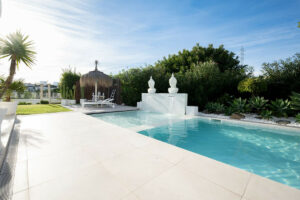 Espectacular piscina climatizada de agua salada de 14 m² con zona infantil, sistema de natación a contracorriente y una romántica cascada: puro estilo resort en casa.