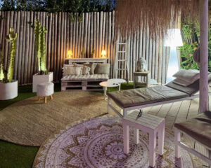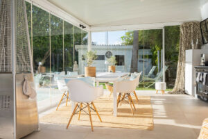 Enorme pérgola cubierta con cocina exterior totalmente equipada y cortinas de cristal, creando una terraza mágica para el entretenimiento durante todo el año, protegida del viento y de las noches más frescas.
