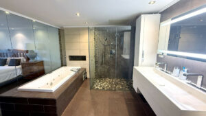 La planta principal también cuenta con dos dormitorios de hermoso diseño, cada uno con su propio baño en suite, lo que garantiza comodidad y privacidad tanto para residentes como para invitados. El dormitorio principal goza de orientación sur, lo que le proporciona abundante luz natural durante todo el día, además de acceso directo al jardín para un remanso de paz.