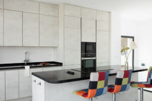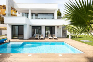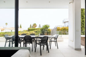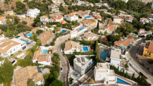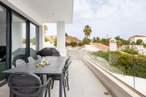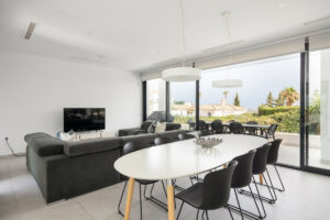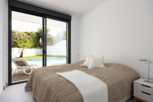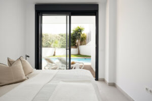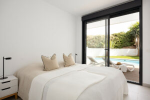 En la planta baja se encuentran tres amplios dormitorios, todos con acceso directo a la terraza y a la zona de la piscina. El dormitorio principal dispone de un lujoso baño en suite y un generoso vestidor. La planta superior impresiona con un diseño de planta abierta, una cocina de última generación de la más alta calidad y un luminoso salón. Desde aquí se accede a la gran terraza, ideal para reuniones sociales, con zona de comedor, área de descanso y barbacoa, además de vistas parciales al mar.