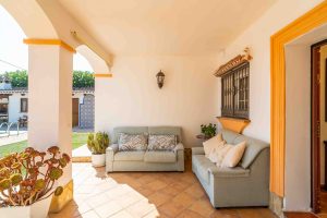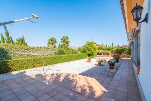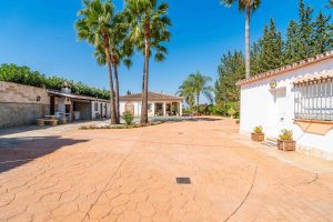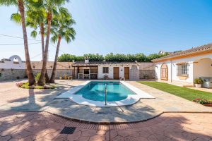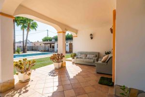 La propiedad se asienta sobre una amplia parcela de 1.400 m², totalmente vallada y con acceso mediante portones automáticos. El jardín, cuidado y rodeado de palmeras maduras, cuenta con una piscina privada con ducha exterior, zona de barbacoa y espacios ideales para relajarse o disfrutar con familia y amigos. Una terraza/porche cubierto de 40 m² ofrece sombra y vistas al jardín y la piscina.