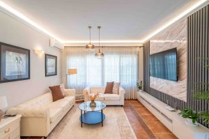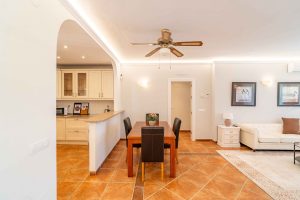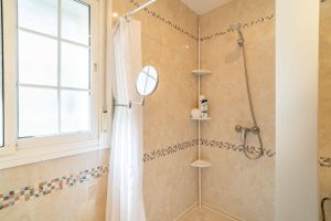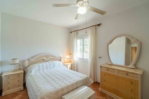 La vivienda principal, en una sola planta y con 140 m² construidos, dispone de un luminoso salón-comedor, cocina abierta amueblada, tres dormitorios y dos baños (uno en suite). Para garantizar el confort durante todo el año, la casa está equipada con aire acondicionado frío/calor, suelo radiante y ventanas de doble acristalamiento.