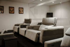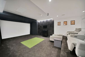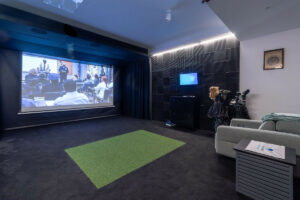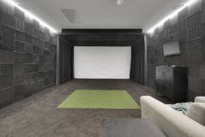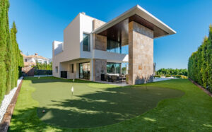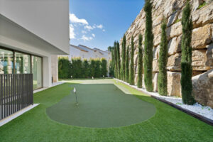 Diseñada pensando en los amantes del golf, la villa cuenta con hoyos para patear en el jardín y un simulador de golf profesional, ofreciendo una experiencia única sin salir de casa.