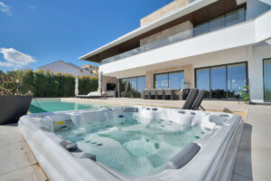 En el exterior, el relax está asegurado con un jacuzzi climatizado y una espectacular piscina privada climatizada, rodeada de jardines impecables. Además, la propiedad cuenta con una zona chill out cubierta con televisión, ideal para disfrutar del aire libre en un ambiente exclusivo.