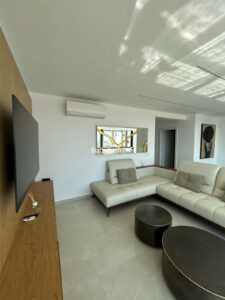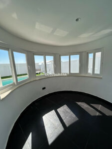 El interior destaca por sus estancias amplias y luminosas, con grandes ventanales que permiten la entrada constante de luz natural, realzando los tonos claros y creando una sensación de bienestar y elegancia.