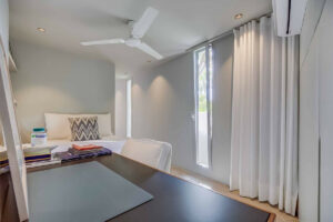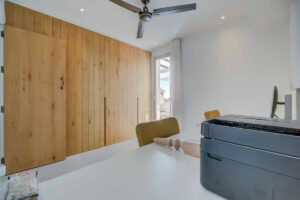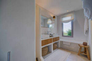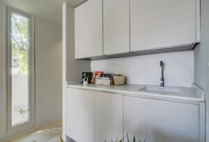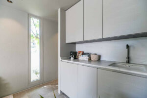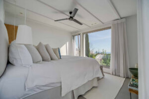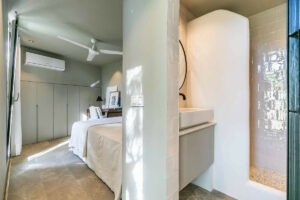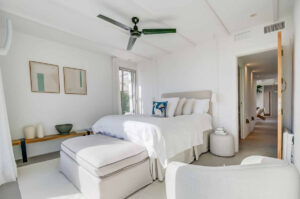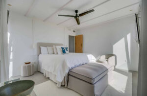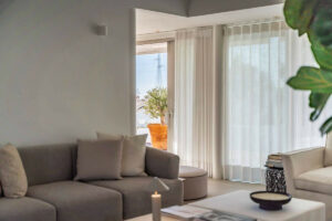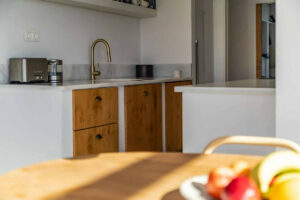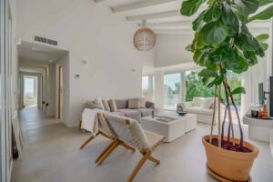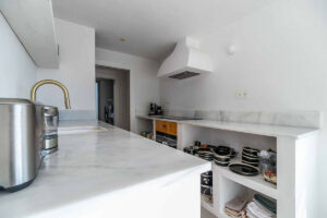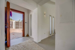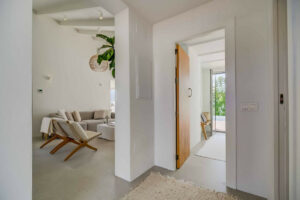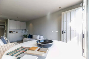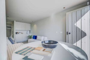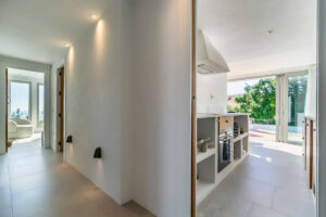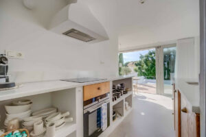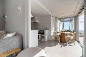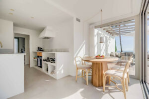 La vivienda principal ofrece un amplio y luminoso salón con grandes ventanales y salida directa a una terraza espaciosa con vistas despejadas al mar. La cocina, completamente equipada y diseñada con líneas modernas, es perfecta tanto para el uso diario como para quienes disfrutan de cocinar y recibir invitados.