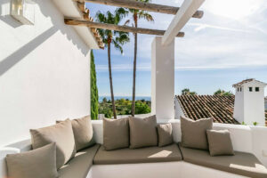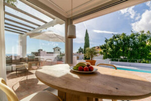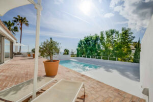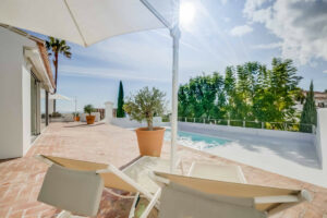 El exterior de la villa invita al relax y al disfrute, con una piscina privada, zonas de sombra, rincones para tomar el sol, palmeras y espacios para comer o reunirse al aire libre durante todo el año. La combinación de vistas al mar, arquitectura mediterránea y jardines cuidados crea un ambiente único para vivir o vacacionar.