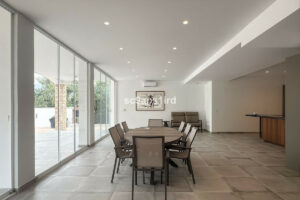 La villa cuenta con un majestuoso hall de entrada con techos altos y ventanas que dejan entrar mucha luz natural. Desde el hall se accede a un aseo de cortesía, y también hay acceso directo desde el garaje a la cocina, lo que facilita llevar las compras a la casa.