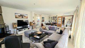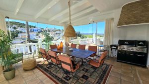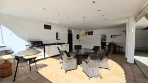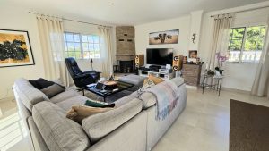La habitación está decorada con buen gusto y amueblada con sofá en forma de L, mesa de centro y mesa de comedor para 6 personas. El salón cuenta con puertas correderas de doble acristalamiento de longitud completa que conducen a una increíble terraza enorme con muebles para 8 personas, con increíbles vistas de la piscina y el área ajardinada del nivel inferior y el extenso campo y las montañas hasta donde alcanza la vista.