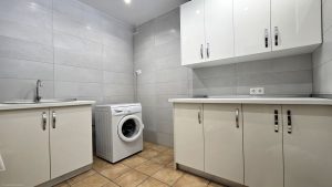 Baja el corto tramo de escaleras. A la izquierda hay una sala de servicios muy grande con fregadero, lavadora, armarios de cocina equipados, también hay almacenamiento y un pequeño pantree.