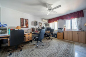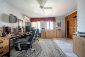 En la planta inferior, un dormitorio actualmente habilitado como despacho, trastero, un dormitorio de gran tamaño con sala de estar integrada y baño independiente, con salida directa al área de piscina.