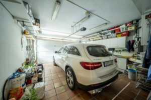 Planta inferior con dormitorio doble, baño completo y garaje privado.
